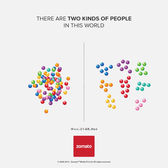 小編平時(shí)說世上的人千差萬別,針對不同的事物又有不同的喜好。但是Zomato公司分析了人們在食物、就餐行為上的偏好,卻發(fā)現(xiàn)了一個(gè)令人驚訝的事實(shí):世界上只有兩種人!隨后他們把這一結(jié)果用一張張插畫海報(bào)對比呈現(xiàn)了出來。小伙伴們快來對號入座吧。