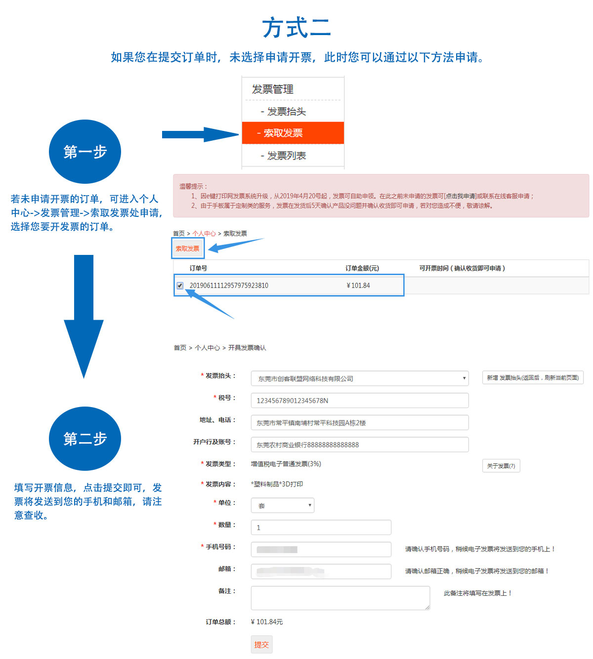 b.在“個人中心->發票管理”處填寫開票信息申請,申請后發票將發送到您的手機或郵箱。